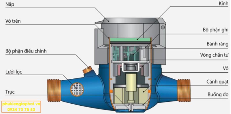 Phần bộ đếm: Đây là chi tiết quan trọng nhất của một đồng hồ, khi dòng chảy đi qua bộ đếm cho nhiệm vụ đưa ra số giá trị lưu lượng đi qua, truyền tải dữ liệu thông qua hệ số các bánh răng đi truyền động liên tục rồi đưa giá trị hiển thị tại phần mặt đồng hồ.